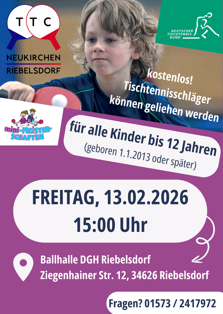 Der TTC Neukirchen-Riebelsdorf lädt am Freitag, den 13.02.2026 um 15:00 Uhr alle interessierten Kinder zu den Minimeisterschaften in Riebelsdorf ein. Auch wer bisher noch kein Tischtennis gespielt hat, ist herzlichen eingeladen. Tischtennisschläger stehen als Leihe zur Verfügung.